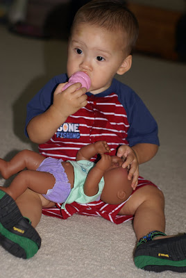 Current Odd thing Jonah does - While lying on his back he throws his leg through the bars of his crib. Of course he gets it stuck. This leads to yelling and crying. Of course, this happens either 20-30 minutes after he's been asleep or in the middle of the night/wee hours of the morning. I'm not quite sure what to do. It's not so regular that I need to line his bed with mesh, but if it keeps happening maybe that's my only option.